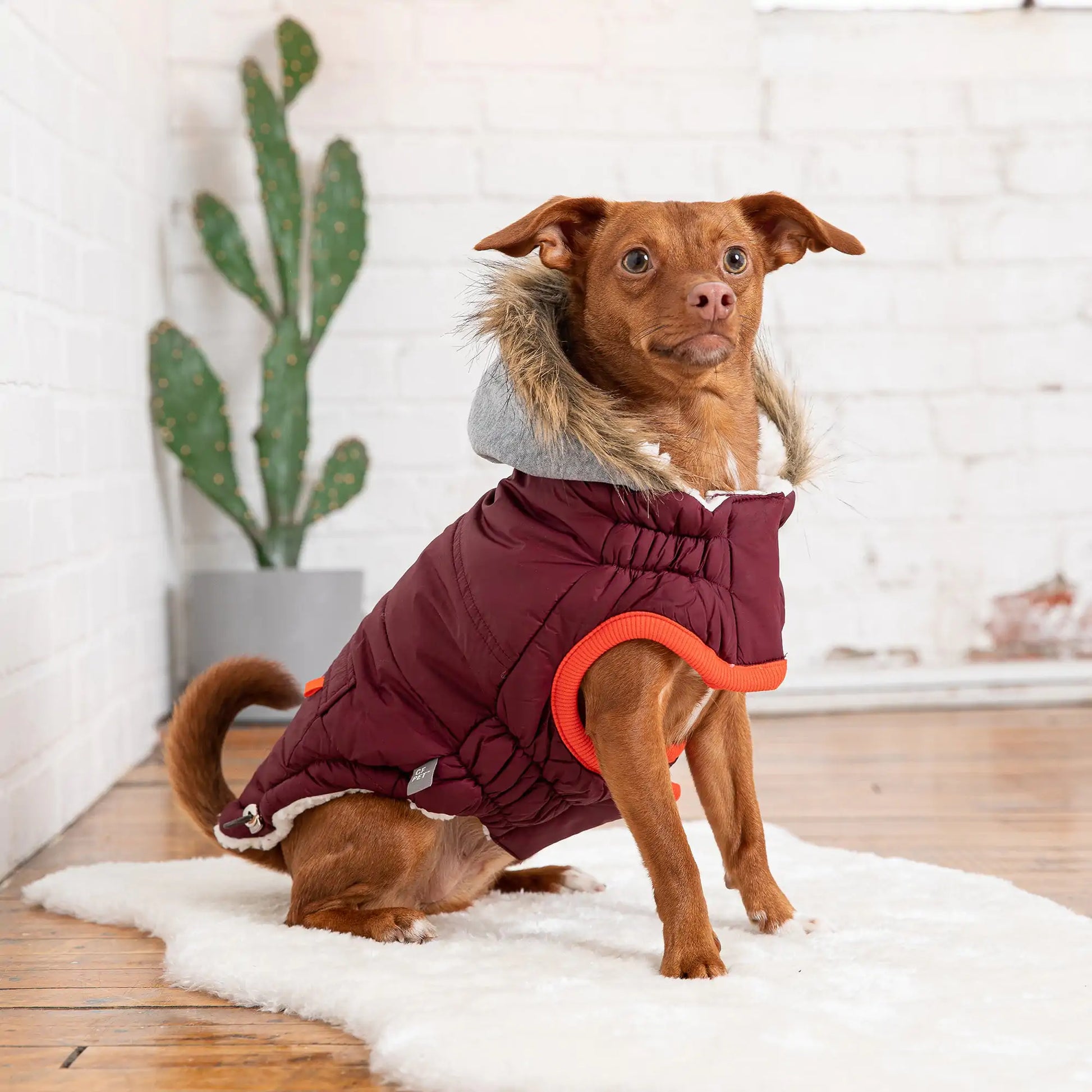 The GF Pet Winter Sailor Parka is the full package. With fresh colors and a tackable vegan fur-trimmed fleece hood, this parka is the ultimate fashion statement with every bit of warmth and comfort you have come to expect from GF Pet. Enjoy deep faux pockets with our signature contrast pocket tabs, and hood tabs. Turn heads at playtime or while strutting the streets, and stay warm and comfy in our luxurious popcorn Sherpa fleece lining! Water repellent and super-adjustable, with patented Elasto-fit technology! Designed for dogs who want it all!